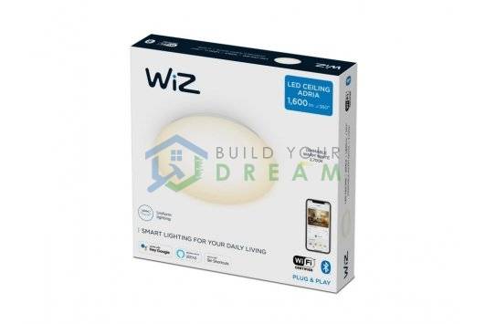 Reglați intensitatea luminii în cameră (fără întrerupător cu variator!) cu lampa de plafon inteligentă WiZ Adria, cu lumină albă, reglabilă, cu LED. Folosiți aplicația WiZ sau vocea pentru a o aprinde și a o stinge sau pentru a reduce sau crește luminozitatea în cameră în medii Wi-Fi. Specificatii tehnice