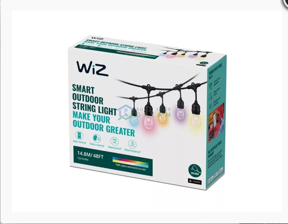 Ghirlanda luminoasa inteligenta LED RGB WiZ, Wi-Fi, 12 becuri, 120 lm, tensiune joasa, comutator pornit/oprit pe fir, lumina colorata, control vocal, IP65/IP44, 14.8m
