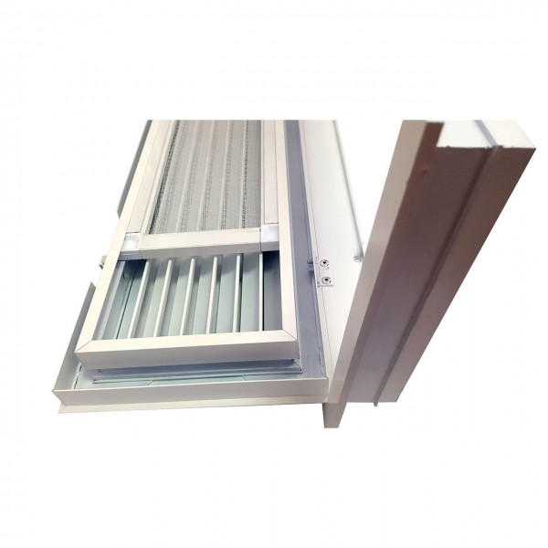 Partea rabatabilă (centrală) a grilelor de aspiraţie - acces posedă un rând de lamele fixe, din profil semirotund, dispuse orizontal sau vertical, în funcţie de cerere. Lamelele sunt fixate în garnitură perimetrală de cauciuc siliconic (material inert la variaţiile de temperatură şi rezistent la îmbătrânire) încastrat în profil, astfel prevenindu-se desprinderea acestora. Tot în acest fel, se înlătură neplacerile cauzate de eventualele zgomote ce pot apărea în timp, datorate curgerii fluxului de aer şi a microvibraţiilor funcţionale. Cadrul suplimentar (contra-rama) va ramâne fixat pe locul de instalare, oferindu-se posibilitatea rabatării doar a grilei propriu-zise, care va ramâne suspendată în balamele şi în sistemul de siguranţă detaşabil. Sistemul de închidere este tip click-clack (închidere/deschidere prin apăsare succcesivă). La cerere, acest sistem de închidere se poate înlocui cu elemente de susţinere magnetică. În urma specificarii în comandă, grilele pot fi prevăzute cu filtru de protecţie fix sau cu filtru detaşabil, cu ramă, culisabil pe şinele special prevăzute pe grilă.Dimensiunile nominale (specificate în comandă) vor fi cele ale cadrului.