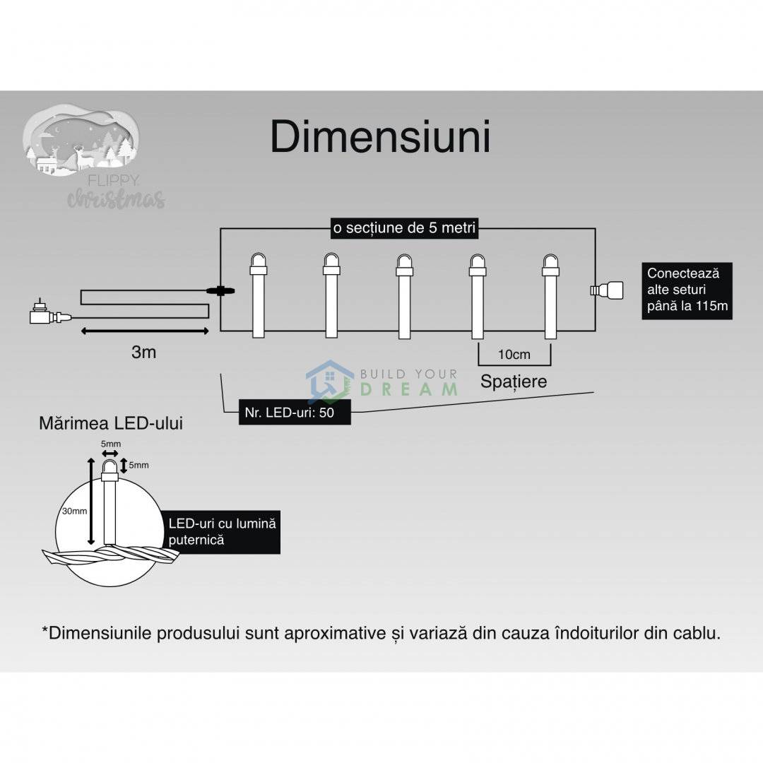 Instalatie Craciun, 5 m, 50 Led-uri ,Liniara, Albastru, 8 jocuri de lumini, Transformator cu telecomanda, Interconectabila, Prelungitor 3 m inclus, Fir Transparent