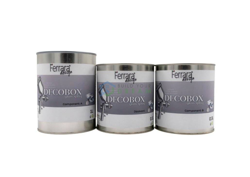 Decobox Glass Spray este un kit conceput pentru protectia stucco-ului, format din 3 componente: componenta A (lac), componenta B (intaritor), componenta C (dizolvant). Dupa aplicare, acesta va crea efectul de oglinda. Se recomanda aplicarea in 2 straturi. Mod de aplicare: Se amesteca componenta A+componenta B, se aplica doar la pistol. Componenta C se utilizeaza pentru curatarea ustensilelor. Randament: 5mp/kit in doua straturi |