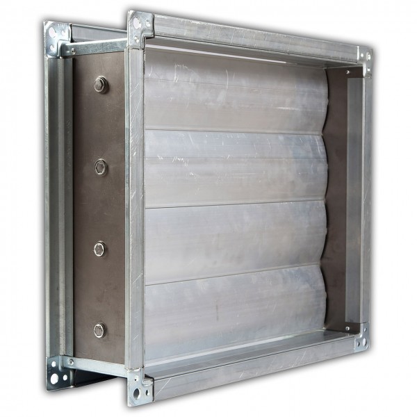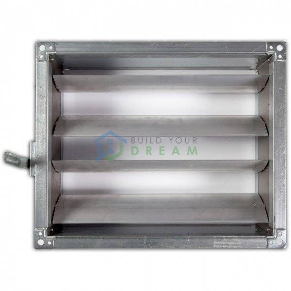 Registre de reglaj cu pârghie pentru tubulatură rectangularăAplicaţii:Registrele de reglaj cu pârghie pentru tubulatură rectangulară sunt utilizate pentru reglarea debitului de aer în conductele de ventilaţie. Descriere: Registrele de reglaj cu pârghie pentru tubulatură rectangulară sunt formate dintr-o carcasă din tablă zincată (adâncime de 150 mm) cu flanşă de 20/30 mm şi au lamelele din aluminiu (lăţime de 100 mm). Mecanismul de rotaţie a lamelelor este realizat printr-un mecanism de tip bielă-manivelă amplasat în partea exterioară a registrului. Registrele pot avea lamele care se deschid opozabil sau paralel. În cazul deschiderii paralele a lamelelor nu se poate face reglaj de debit (pot fi complet inchise sau complet deschise). Registrele nu conţin elemente din plastic. Acestea pot fi acţionate manual sau pregătite pentru conectare la servomotor. Temperatura de lucru: -20°C to +120°C. |