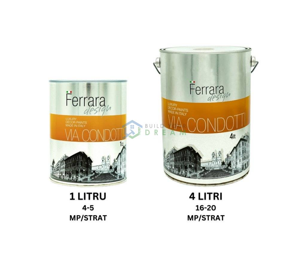 Viacondotti este o vopsea decorativa pe baza de apa, ecologica, ce contine un cuart cu granulatie mare. Aplicarea ei se poate face intr-un singur strat precum vopseaua decorativa Davinci. In catalog este prezentata in doua straturi. Glitter-ul este inclus. Ideala si pentru tinci. Mod de aplicare: Se aplica 1 sau 2 straturi de fond special al decorativei (Fondo Ruvido), diluat in prealabil cu 20-40% apa. Ulterior, se aplica vopseaua decorativa cu pensula, in doua straturi, fara a se satira. Atentie: aplicarea intr-un singur strat, tip Davinci, nu este valabila pentru toate nuantele. Va rugam sa consultati un reprezentant Ferrara Design. Randament: 4-5mp/litru in doua straturi. |